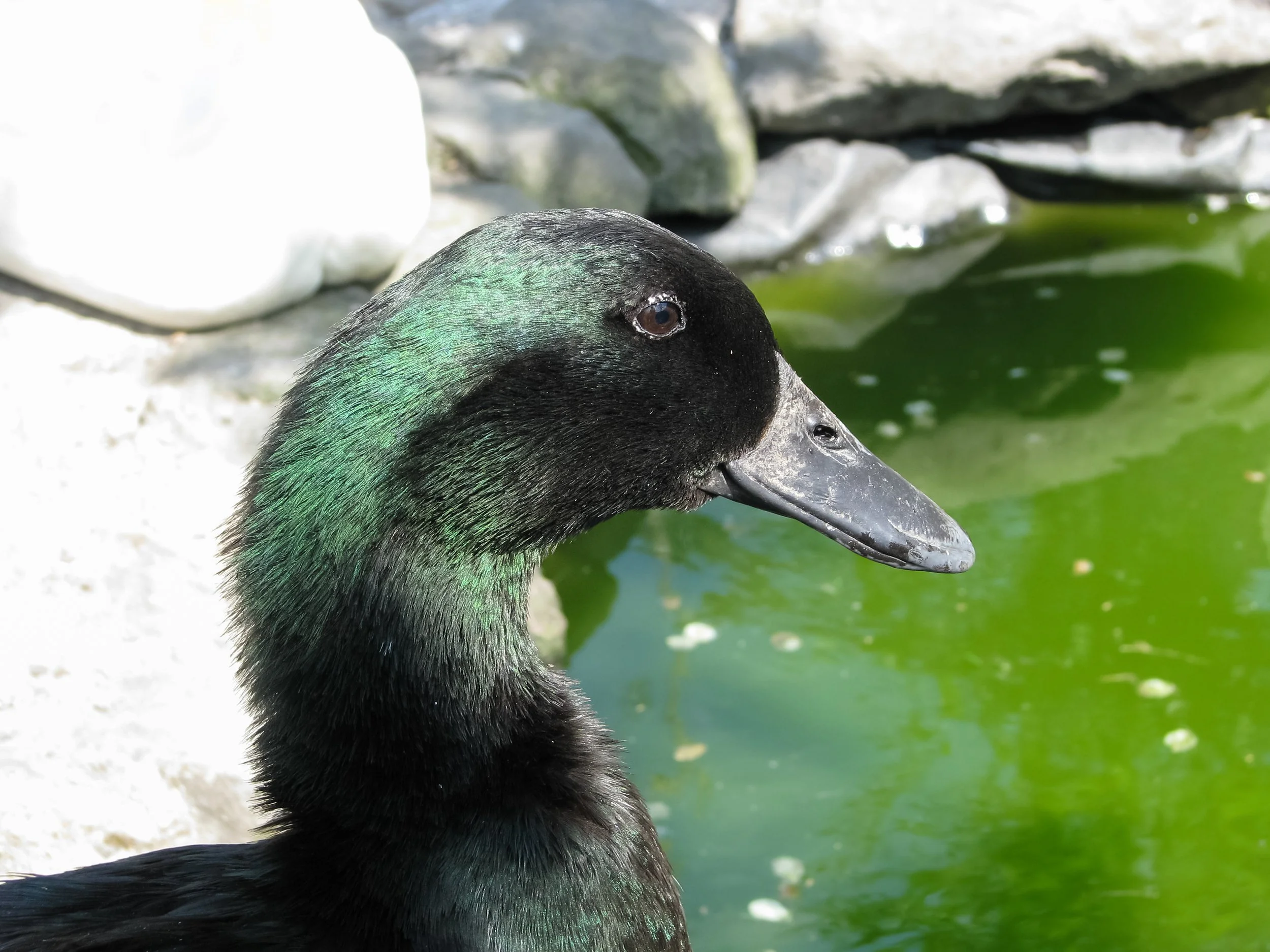 Cayuga ducks are a prized showy breed. Black to iridescent green feathers in the sunlight, and black legs and feet make them stand out. We’ve had people pull off the road above our pond to ask us about them!